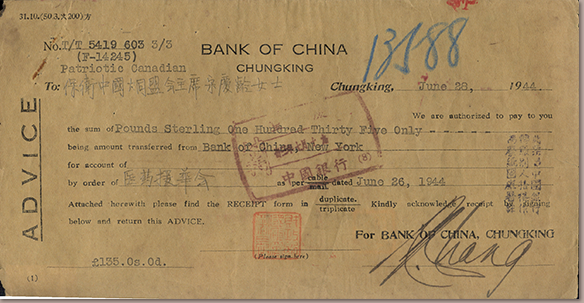 加拿大医药援华会给保卫中国同盟主席宋庆龄的汇款传票。1938年6月,宋庆龄在香港创立保卫中国同盟,向国际社会宣传中国抗战,争取国际援助,为八路军、新四军募集了大量物资。
